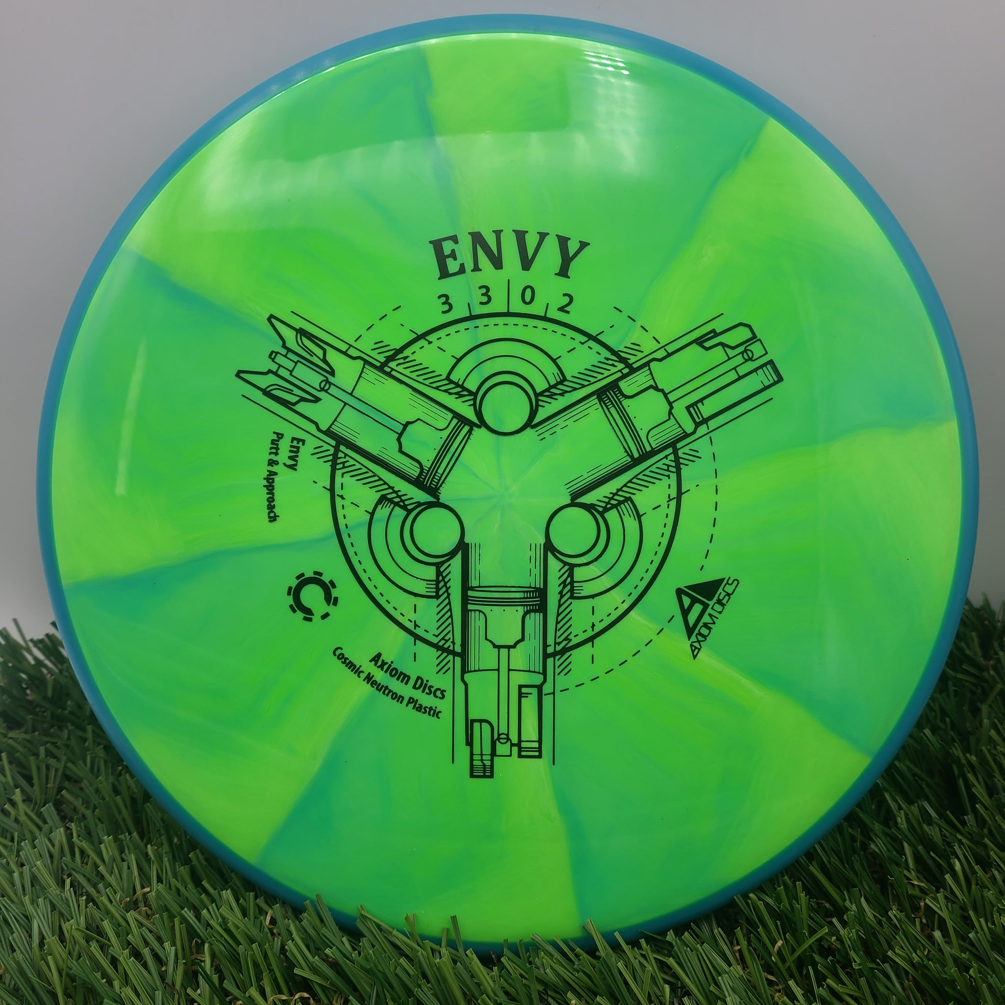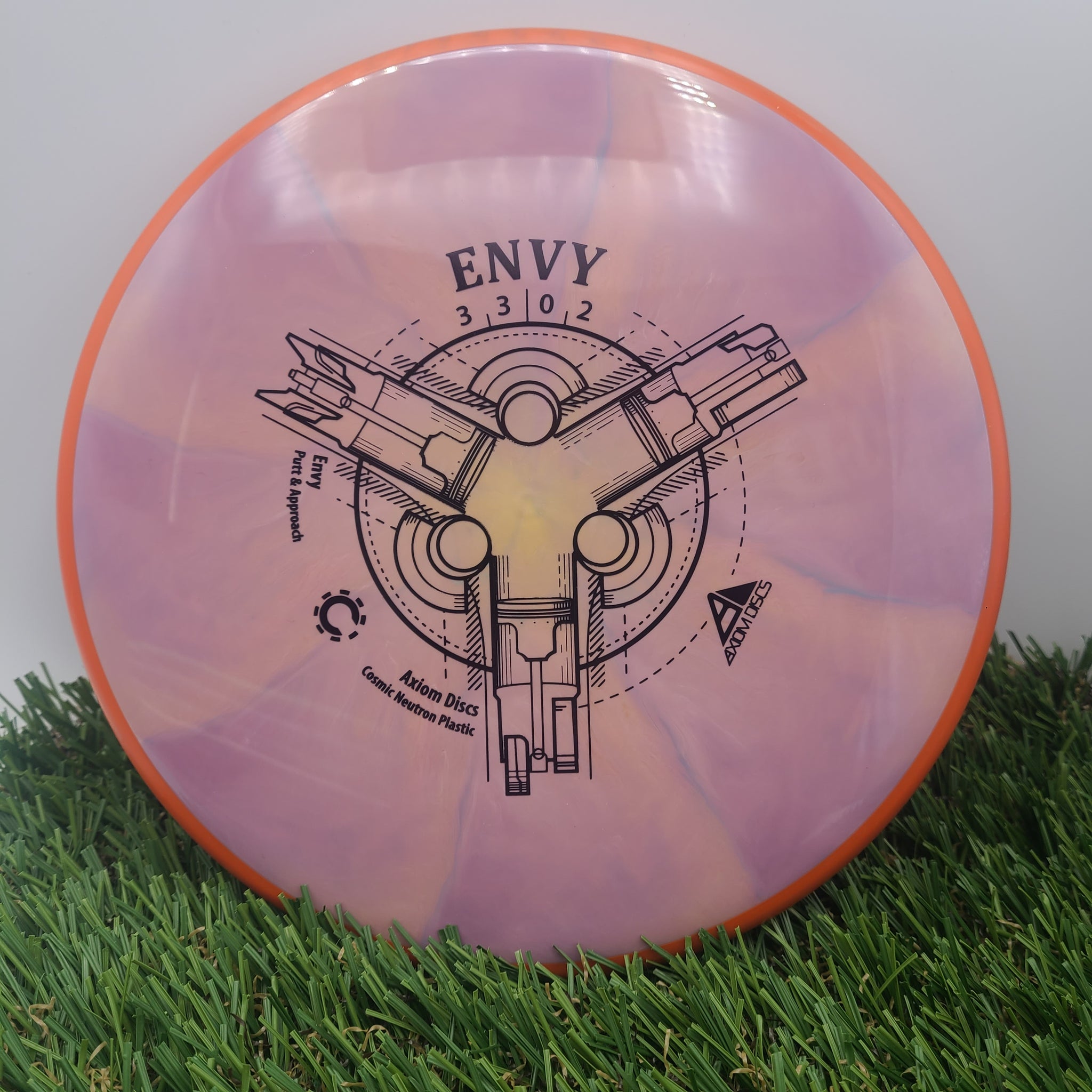 The Axiom Envy is the first putt & approach disc in the new Axiom line. Compared with the MVP Ion and Anode, this disc is beefier and has a thicker wing. The Envy is a slower, more overstable, putter that is stable at high speeds with a dependable drop. It is described as a uniquely “lid-like” putter. This new disc will still feature MVP’s overmold GYRO technology.