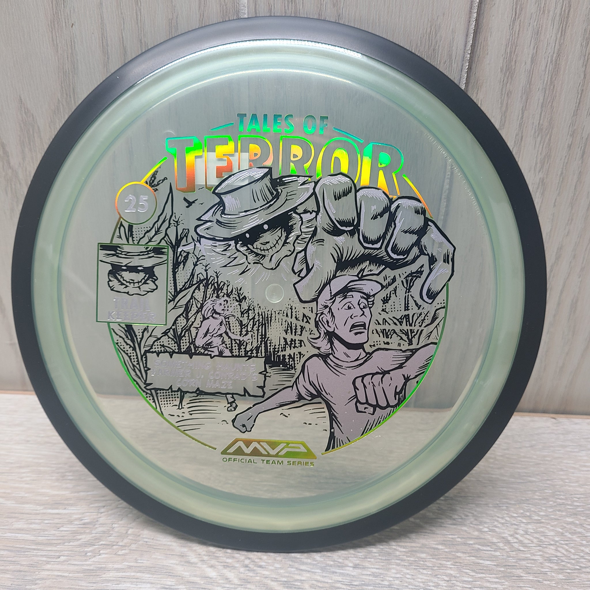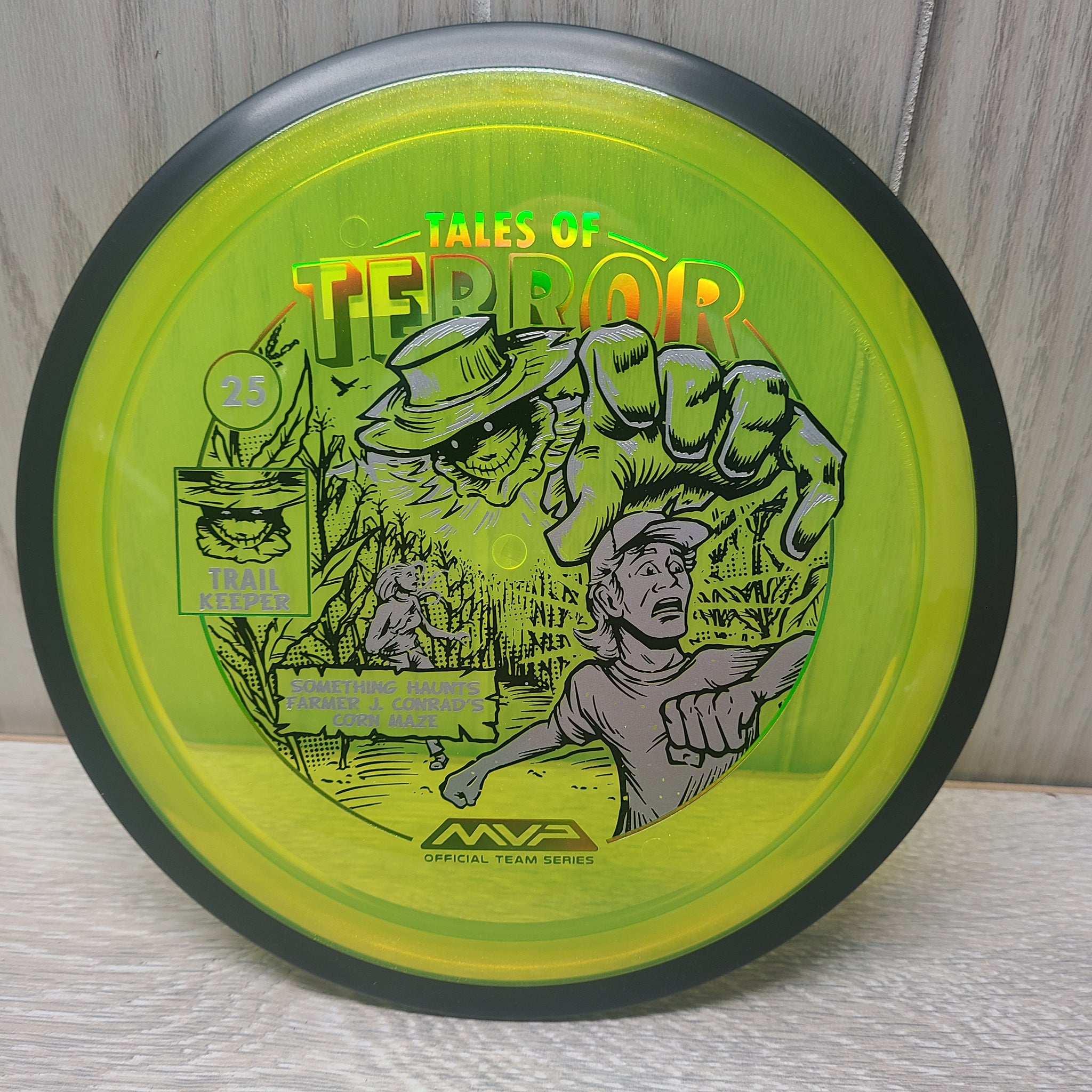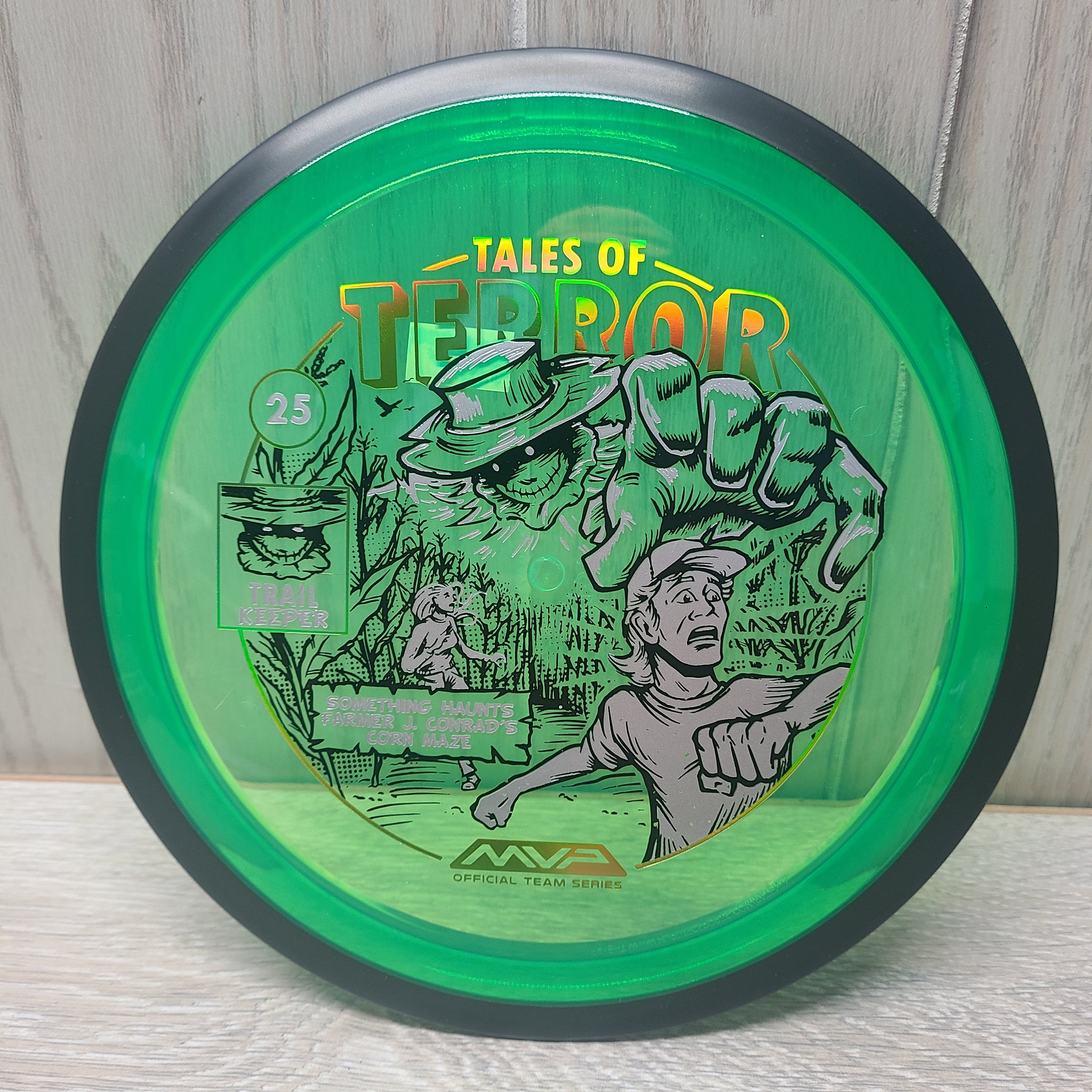 The highly requested fan favorite Proton Trail has returned! Green C Studio adorns this disc with a glimpse of the Trail Keeper haunting Conrad’s Corn Maze, a classic horror story. Excelling in hyzer-flip drives, turnovers, and straight shots, the Trail has become one of the most popular drivers in the MVP lineup that throwers of all power levels will find significant use for. You don’t have to get lost in a killer corn field to get your hands on one of these, just head over to your favorite local or online MVP dealer to get yours today!