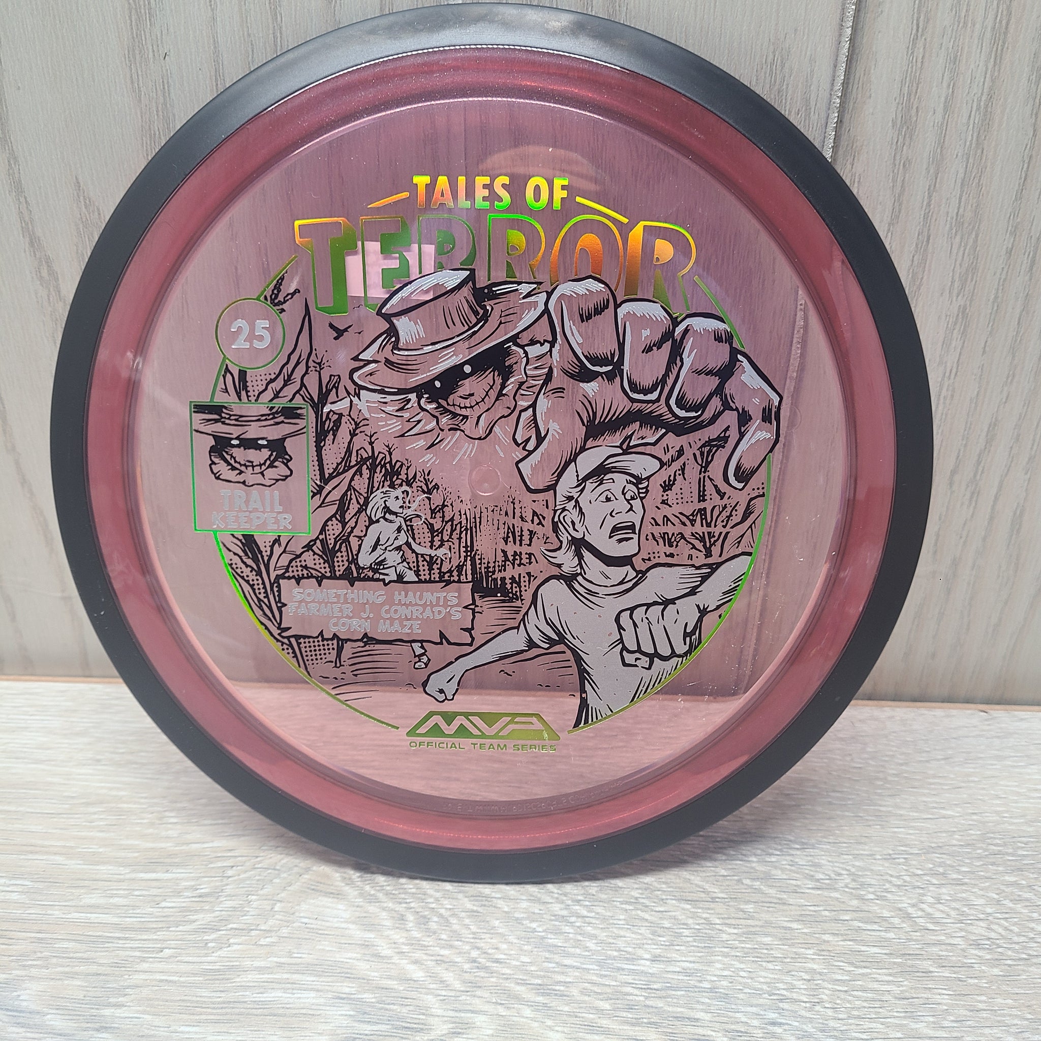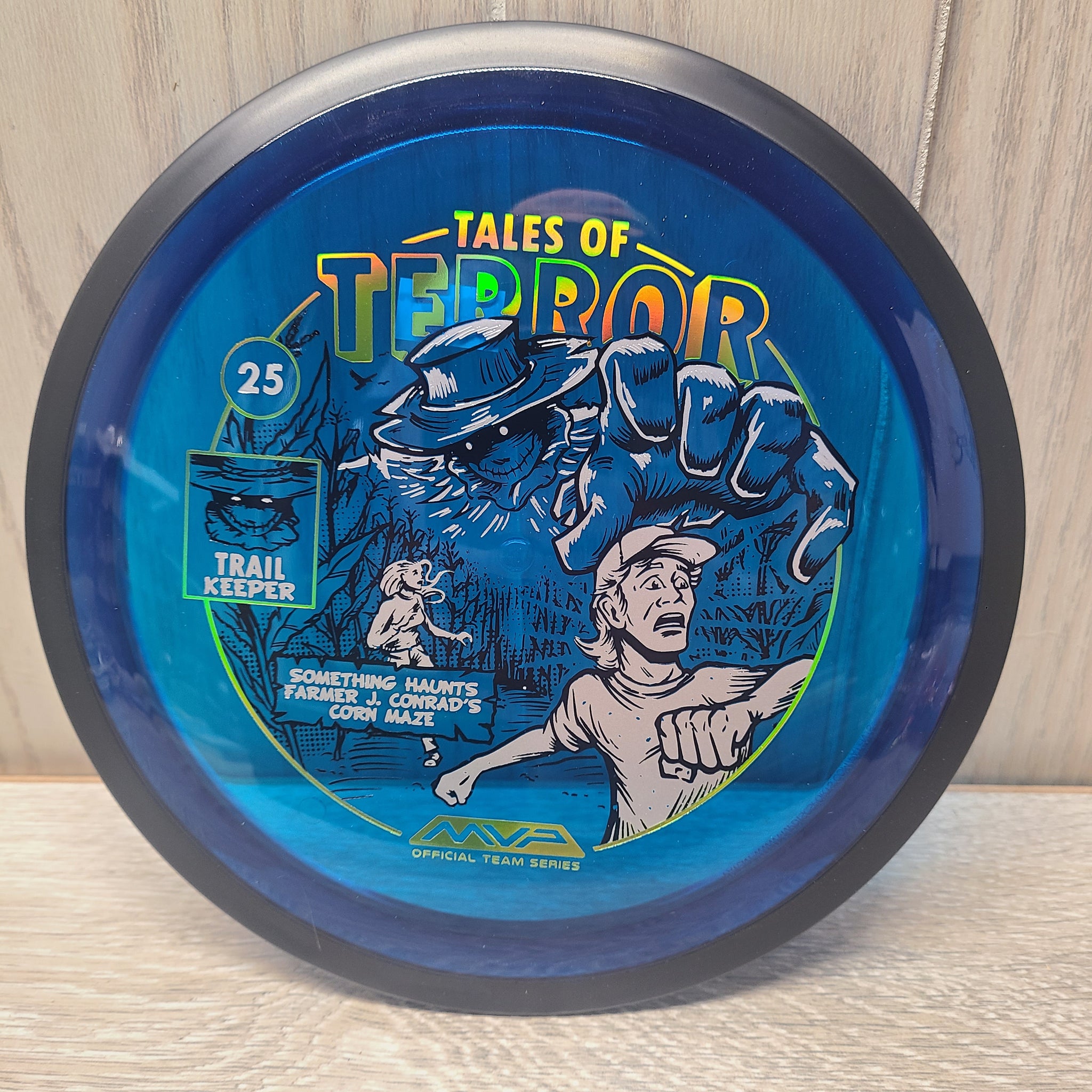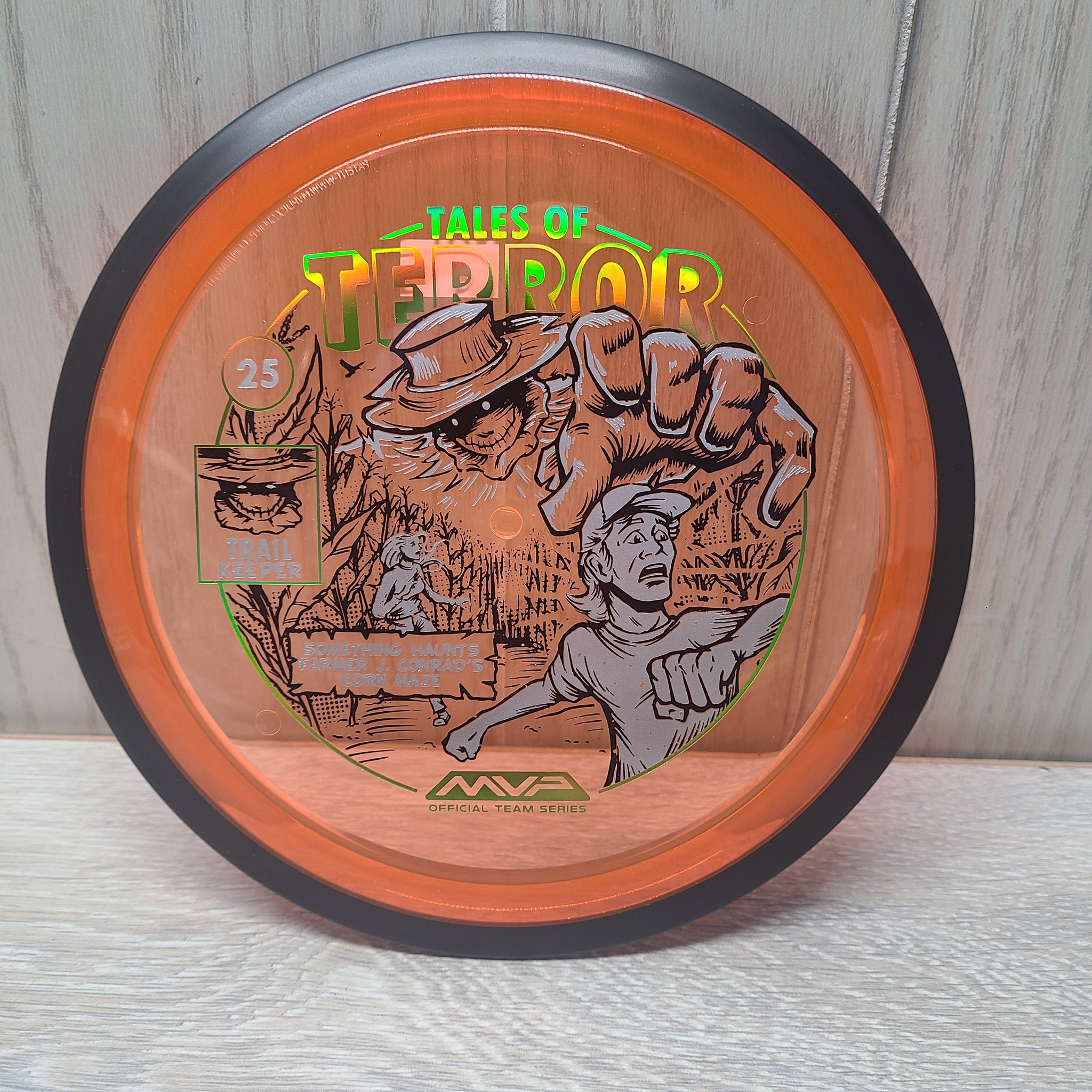 The highly requested fan favorite Proton Trail has returned! Green C Studio adorns this disc with a glimpse of the Trail Keeper haunting Conrad’s Corn Maze, a classic horror story. Excelling in hyzer-flip drives, turnovers, and straight shots, the Trail has become one of the most popular drivers in the MVP lineup that throwers of all power levels will find significant use for. You don’t have to get lost in a killer corn field to get your hands on one of these, just head over to your favorite local or online MVP dealer to get yours today!
